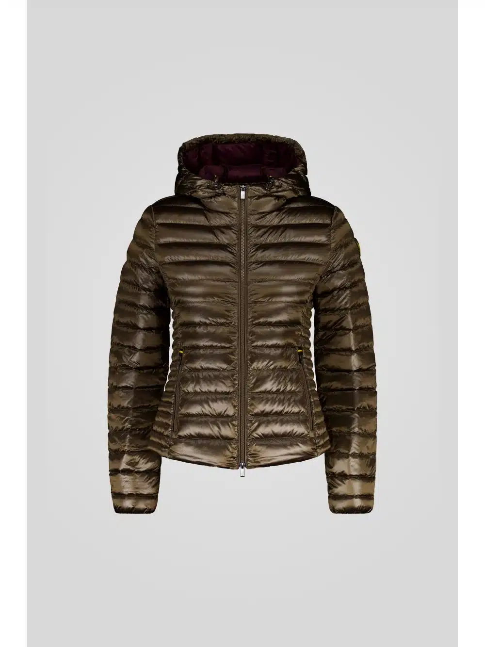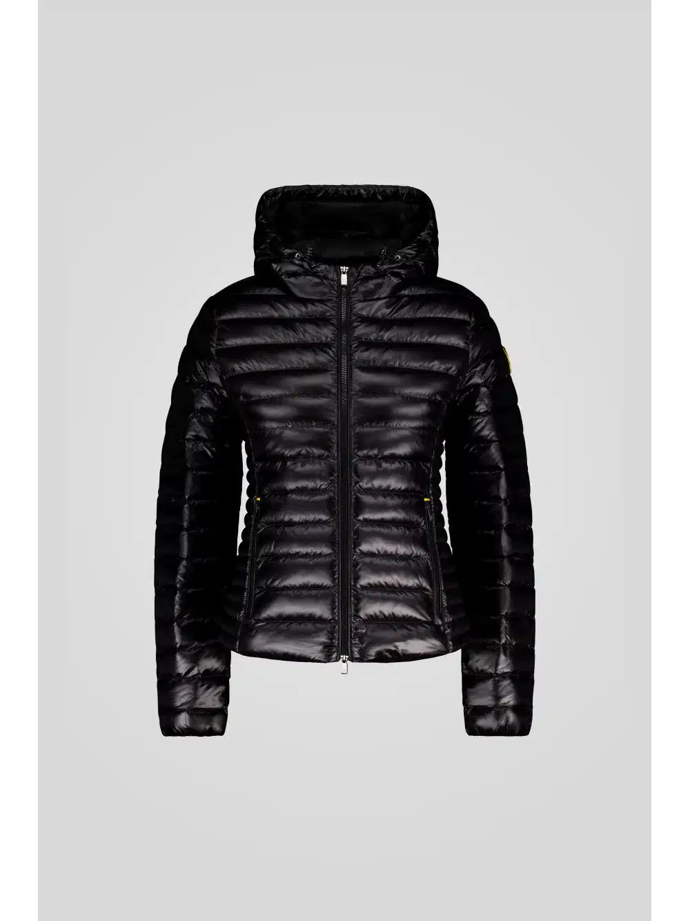 GIACCA PIUMINO TRAPUNTATA CON CAPPUCCIO E DETTAGLI GIALLI SULLE CERNIERE.