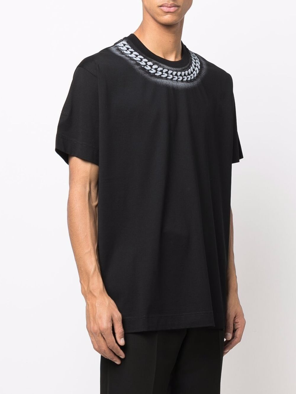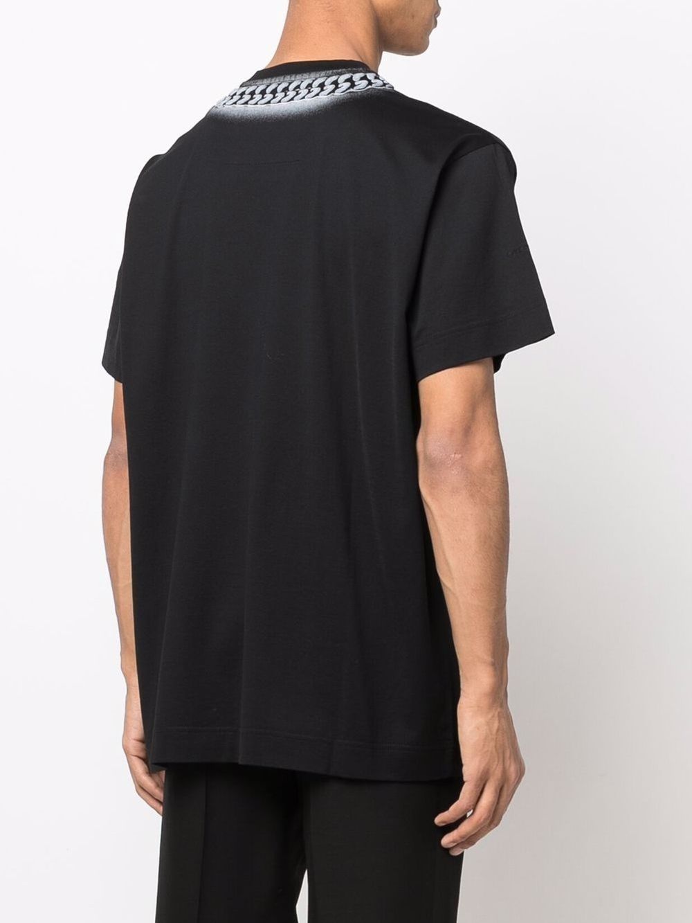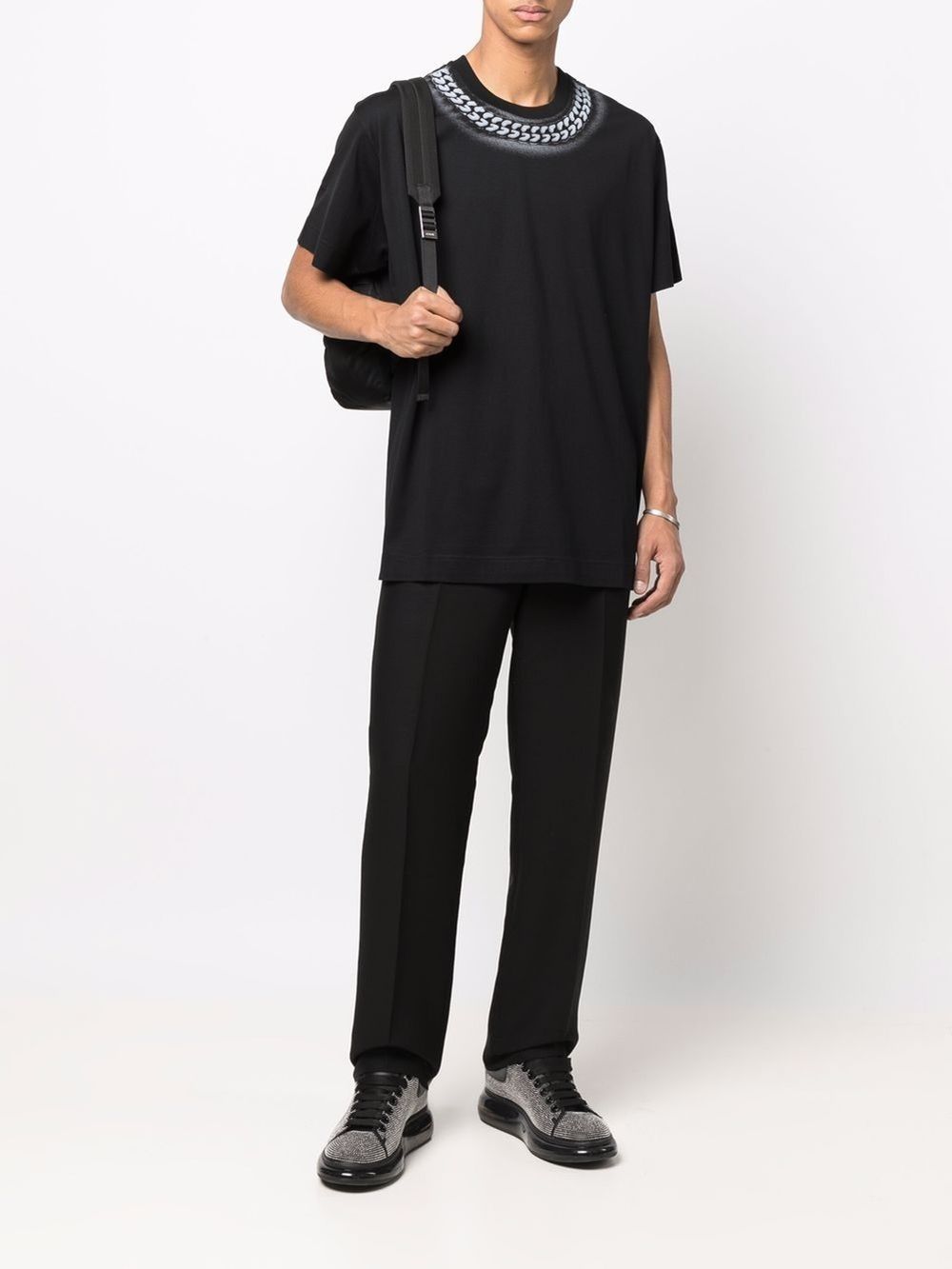Descrizione T-shirt Givenchy “Necklace Print” Una t-shirt iconica e d’impatto, firmata Givenchy, con un design unico che riproduce l’effetto di una catena stampata sul girocollo, per un look streetwear di lusso. Caratteristiche principali: Colore: Nero profondo Materiale: 100 Cotone premium, morbido e traspirante Design: – Stampa effetto collana in tonalit argento attorno al collo, per un dettaglio distintivo – Vestibilit oversize, per un look moderno e rilassato – Girocollo classico, con cuciture rinforzate – Maniche corte, perfette per essere indossata da sola o sotto una giacca Come abbinarla: Streetwear di Lusso: con jeans slim fit distressed e sneakers chunky per un look urban esclusivo. Casual Chic: con pantaloni sartoriali e mocassini per un outfit sofisticato e originale. Layering di Tendenza: sotto un bomber o un blazer per uno stile versatile e cool. Perch sceglierla? Questa t-shirt Givenchy unisce il minimalismo all’audacia del dettaglio stampato, creando un capo sofisticato e riconoscibile. Perfetta per chi ama la moda high-end con un tocco street-style. Un must-have per gli amanti del lusso contemporaneo!
