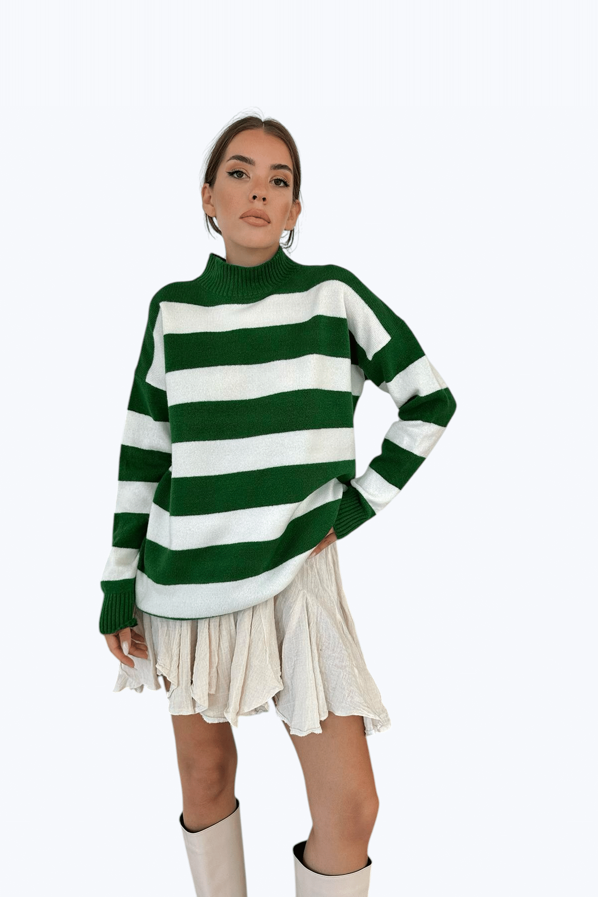 Descrizione del Maglione Questo maglione dallo stile casual-chic perfetto per la stagione autunnoinverno, unendo comfort e tendenza con un tocco sportivo. Caratteristiche: Colore: Verde intenso con righe orizzontali bianche. Modello: – Fit oversize, ampio e comodo per un look rilassato e alla moda. – Girocollo alto e lavorazione a coste, per una maggiore aderenza e protezione dal freddo. – Maniche lunghe e polsini elasticizzati, che donano struttura al capo. Materiale: Probabilmente misto lana o cotone caldo, perfetto per linverno. Come abbinarlo: Look casual e comfy: Indossalo con jeans a gamba larga e sneakers bianche. Look preppy chic: Perfetto con una gonna plissettata e stivali alti, per un outfit raffinato ma alla moda. Look sporty streetwear: Pu essere abbinato a leggings in pelle e anfibi per un tocco grunge. Un maglione versatile e trendy, perfetto per chi ama il comfort senza rinunciare allo stile!