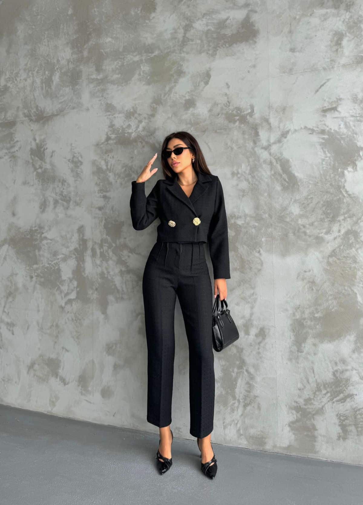 Descrizione del Completo Tailleur Nero Un elegante e sofisticato completo nero, perfetto per occasioni formali o per un look da ufficio impeccabile. Caratteristiche: Colore: Nero classico, versatile ed elegante. Materiale: Probabilmente un misto di poliestere e viscosa per una vestibilit strutturata ma confortevole. Design: – Blazer doppiopetto corto, con taglio aderente che valorizza il punto vita. – Dettagli di bottoni dorati, che aggiungono un tocco di raffinatezza. – Pantaloni a vita alta, con gamba dritta per una silhouette slanciata ed elegante. Come abbinarlo: Look da ufficio: Con una camicia bianca o un top semplice per un effetto professionale. Look da sera: Con un body aderente o un top in pizzo per un tocco pi seducente. Look casual chic: Con un crop top e sneakers per un mix di eleganza e streetwear. Un completo perfetto per chi vuole trasmettere sicurezza e classe con un tocco glamour!