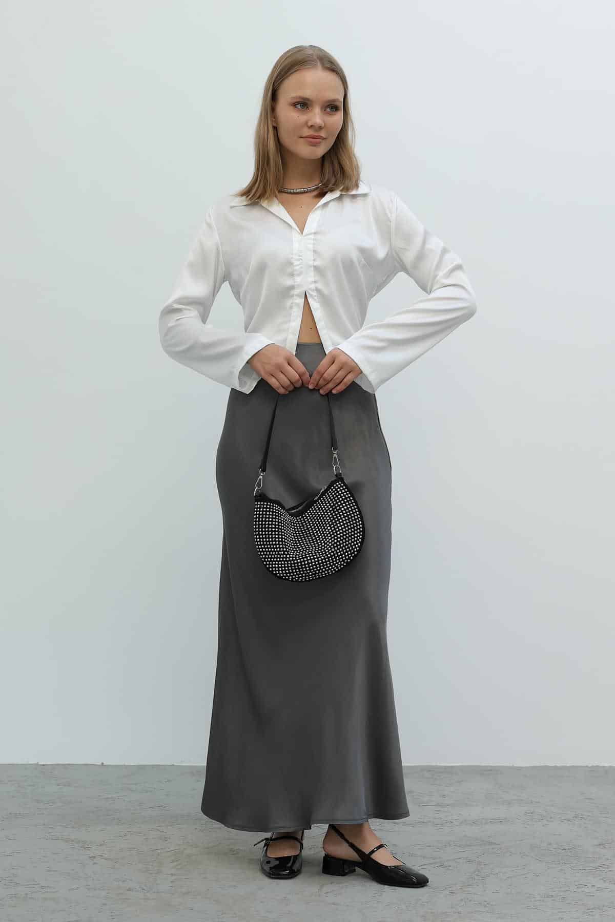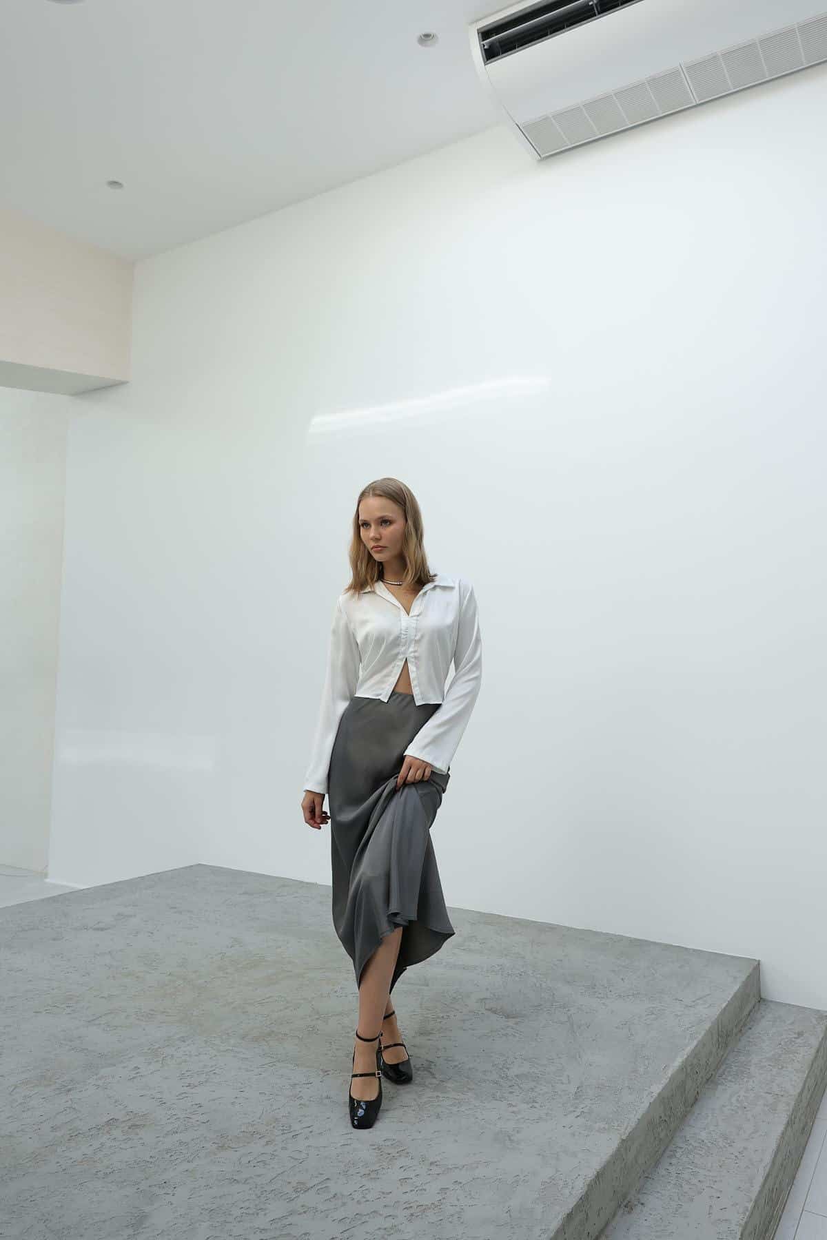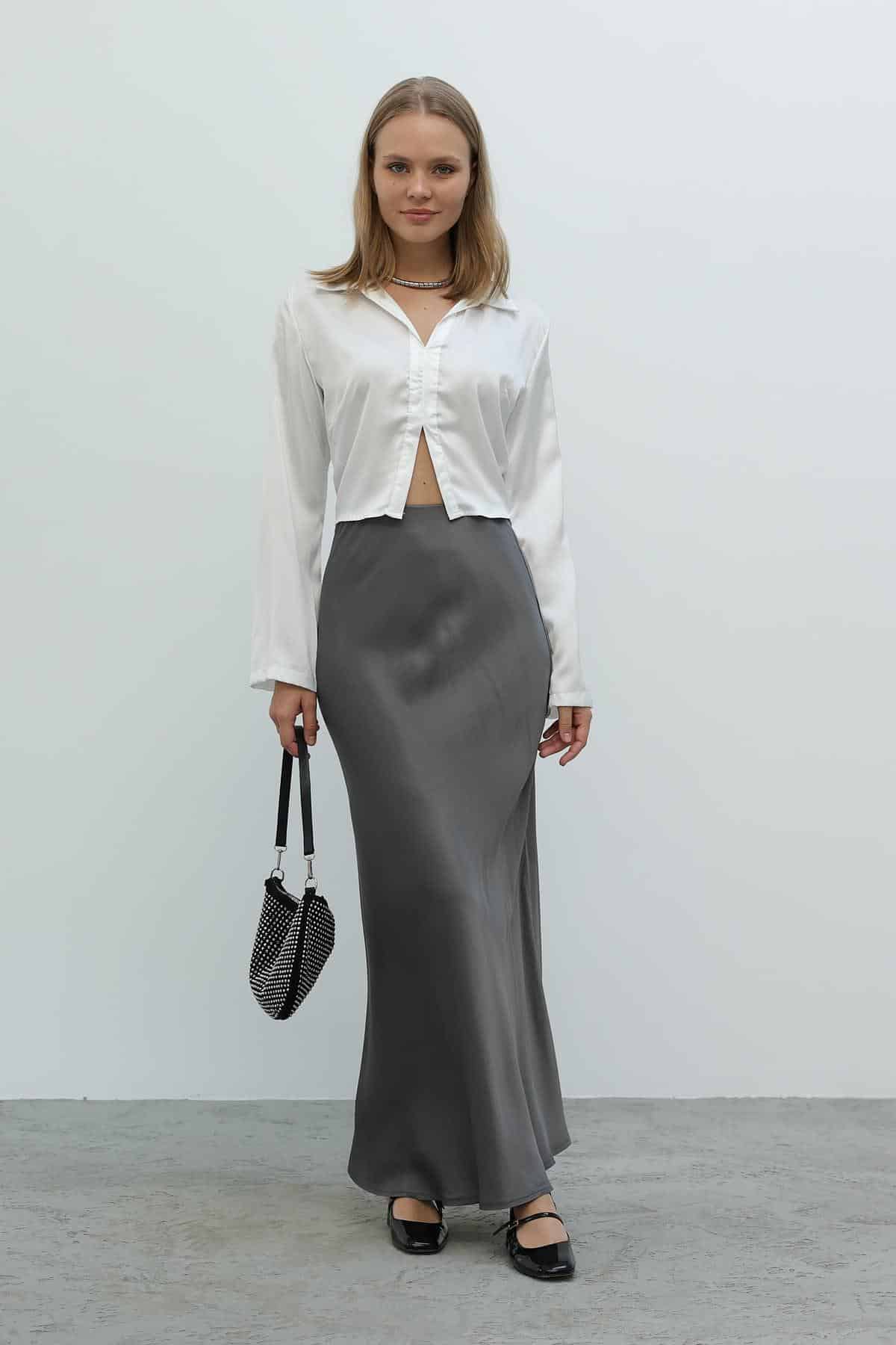 Questa gonna lunga grigia satinata un capo sofisticato ed elegante, perfetto per chi ama uno stile minimal-chic con un tocco glamour. Caratteristiche: Colore: Grigio satinato, versatile e raffinato. Vestibilit: Scivolata e aderente nella parte superiore, creando una silhouette slanciata. Lunghezza: Lunga fino alla caviglia, ideale per un look femminile e sofisticato. Tessuto: Probabilmente raso o satin, con un effetto leggermente lucido che esalta il movimento e la fluidit del capo. Stile: Elegante, minimalista e molto trendy, perfetto sia per il giorno che per la sera. Come abbinarla: Con una camicia bianca crop come in foto per un look chic e moderno. Con un body aderente e un blazer oversize per un outfit da sera raffinato. Con sneakers e una t-shirt basic per un mix perfetto tra casual e sofisticato. Abbinata a sandali o dcollet con tacco per un look elegante, oppure con mocassini o ballerine per un tocco pi francese. Un must-have nel guardaroba di chi ama stile ed eleganza senza sforzo!
