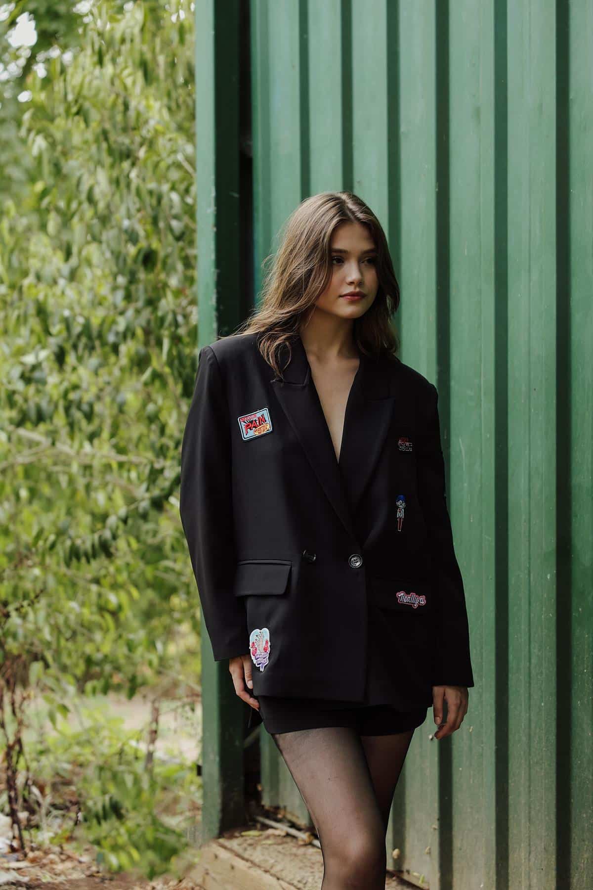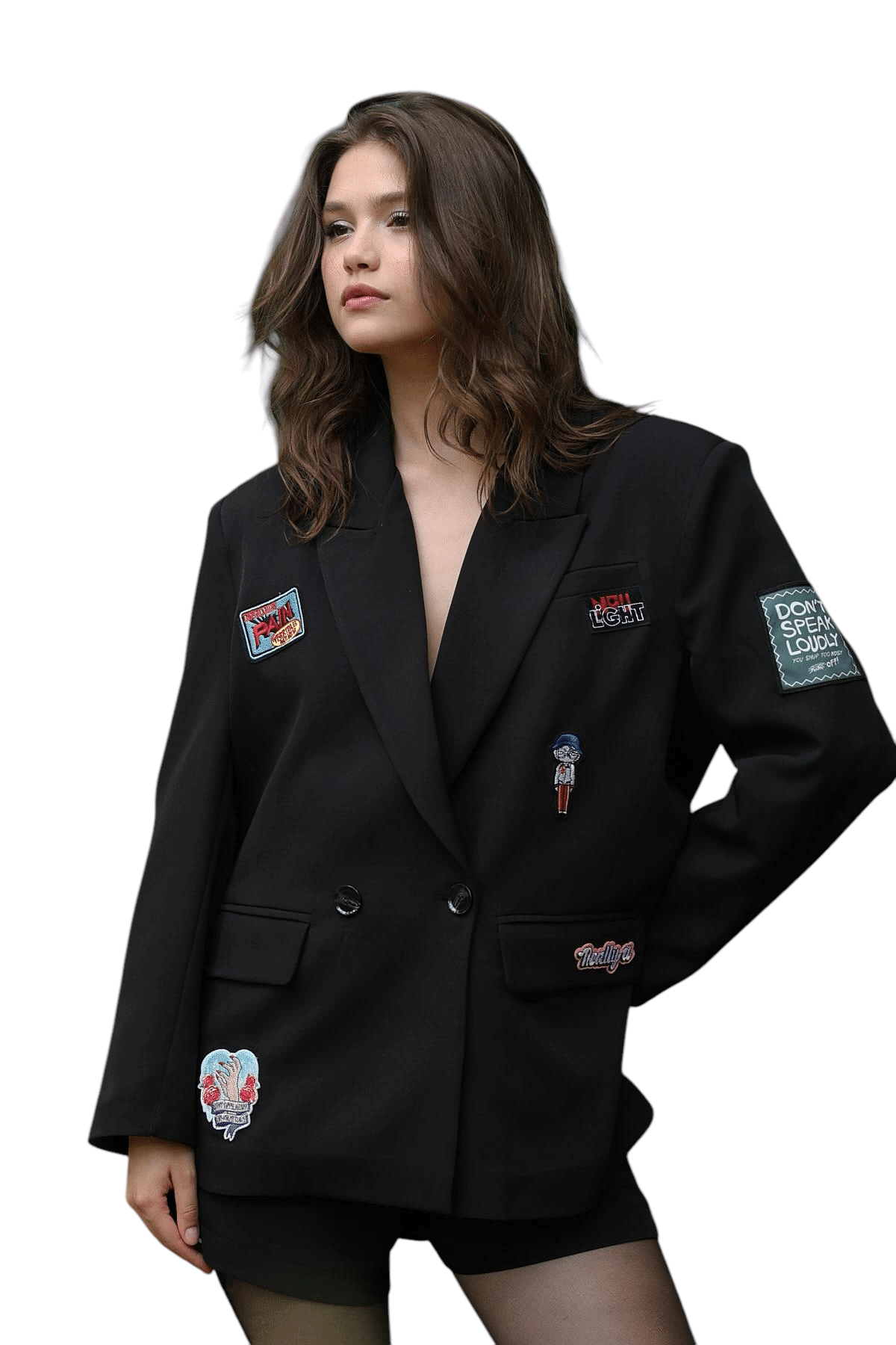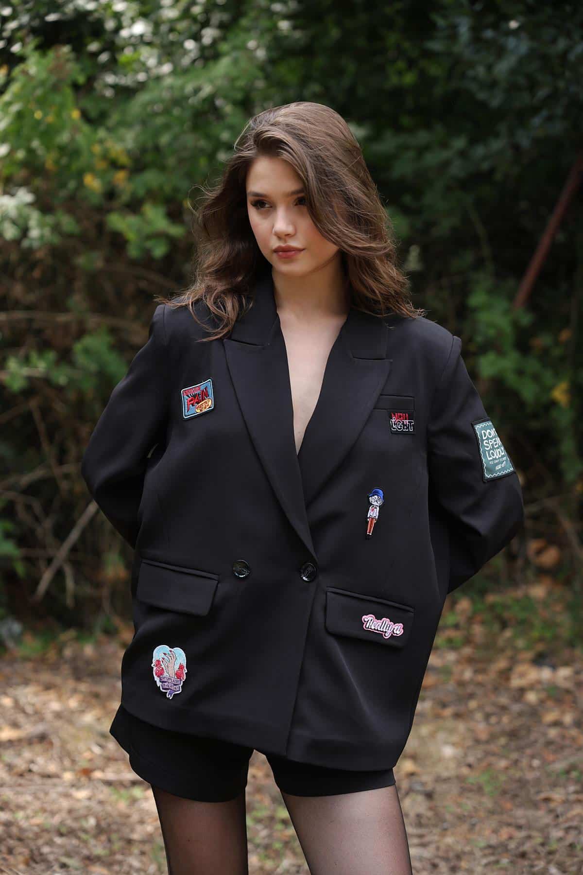 Questo blazer oversize nero un capo audace e alla moda, perfetto per chi ama uno stile urban chic con un tocco di originalit. Caratteristiche: Colore: Nero classico, versatile e sofisticato. Vestibilit: Oversize, per un effetto casual e rilassato, perfetto anche come blazer-dress. Chiusura: Doppiopetto con bottoni neri tono su tono. Dettagli distintivi: Applicazioni patch e ricami su tutta la superficie, che danno un tocco streetwear e personalizzato. Tasche: Due tasche a filetto con patta, per un look strutturato. Spalle: Leggermente strutturate, per un effetto power-dressing. Come abbinarlo: Con shorts e collant velati per un look grintoso e femminile. Indossato sopra un crop top e jeans skinny per un contrasto di volumi. Perfetto anche con stivali al ginocchio o dcollet a punta per uno stile pi sofisticato. Pu essere portato chiuso come mini-abito o aperto sopra un look casual-chic. Un pezzo statement perfetto per chi vuole distinguersi con un outfit strong e alla moda!