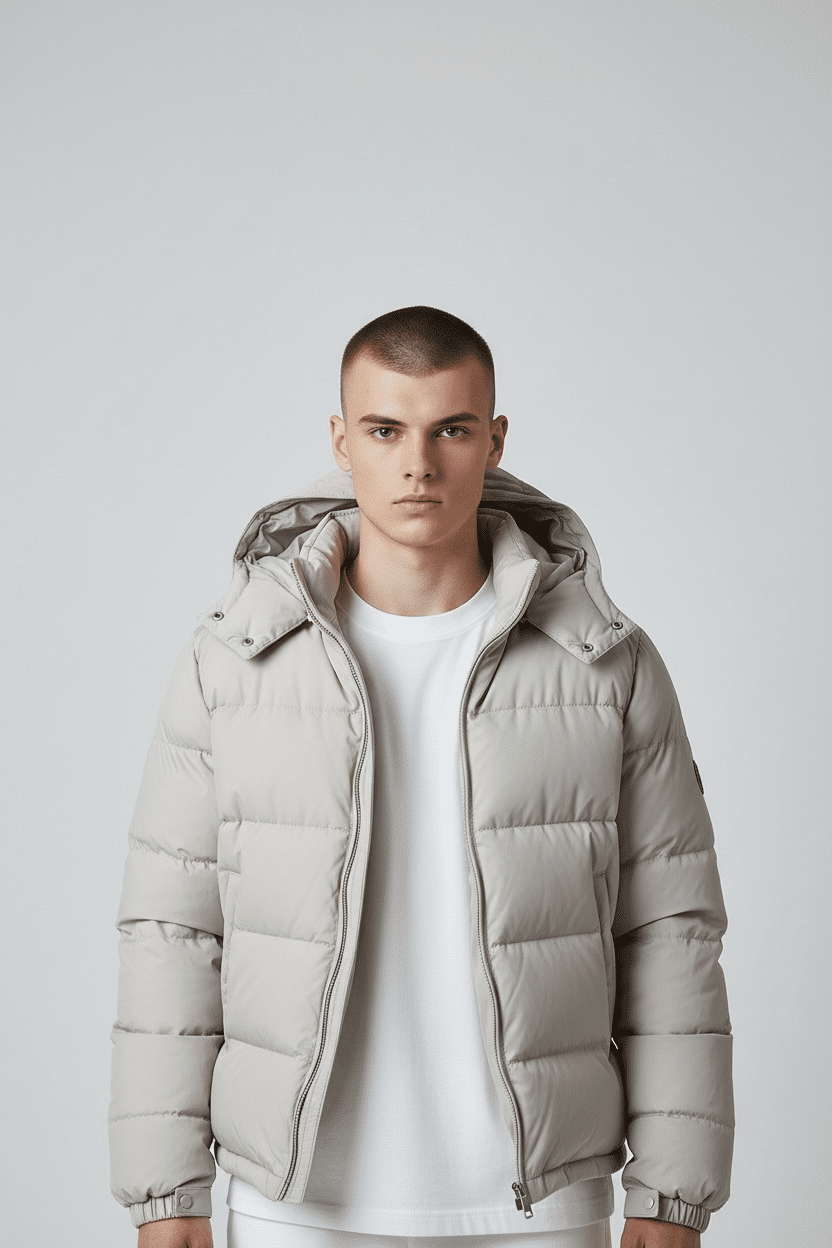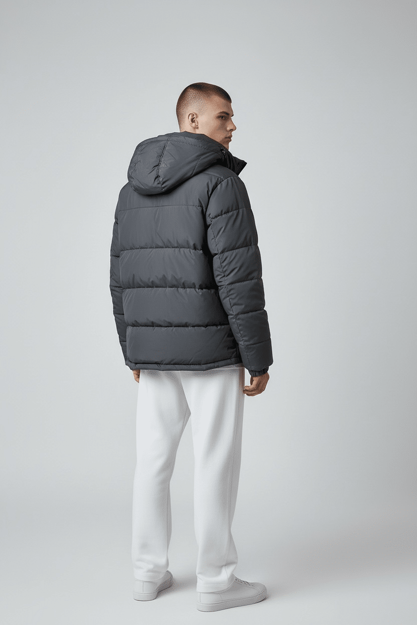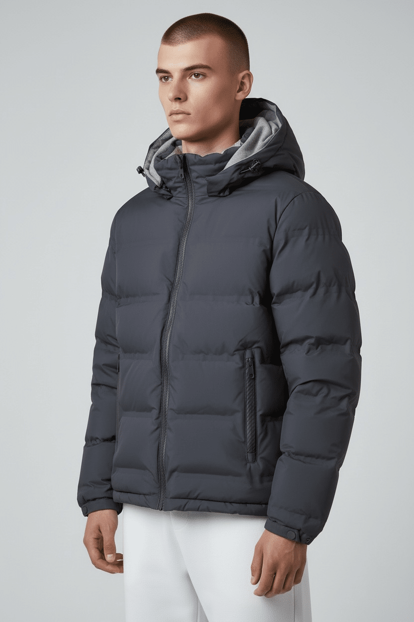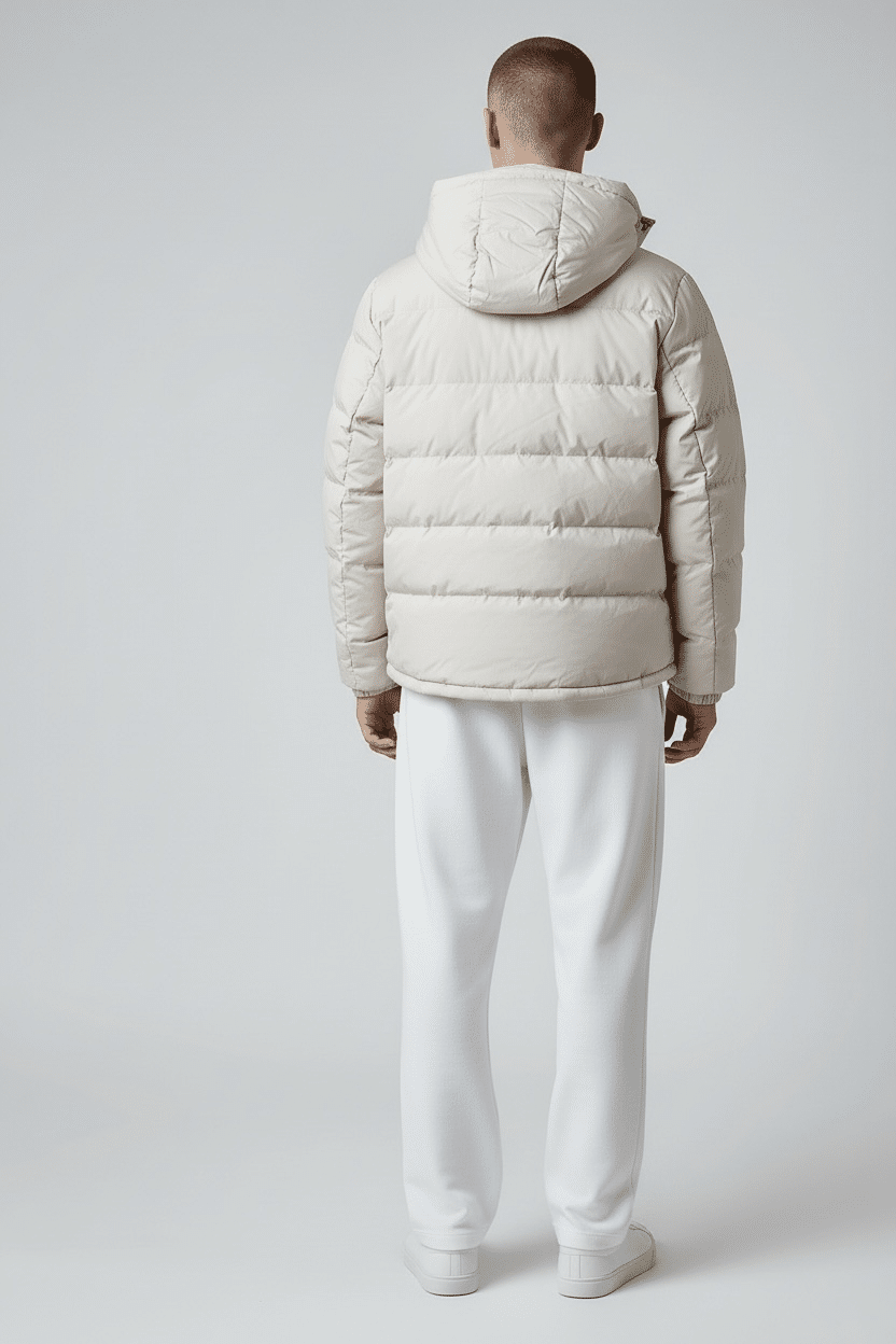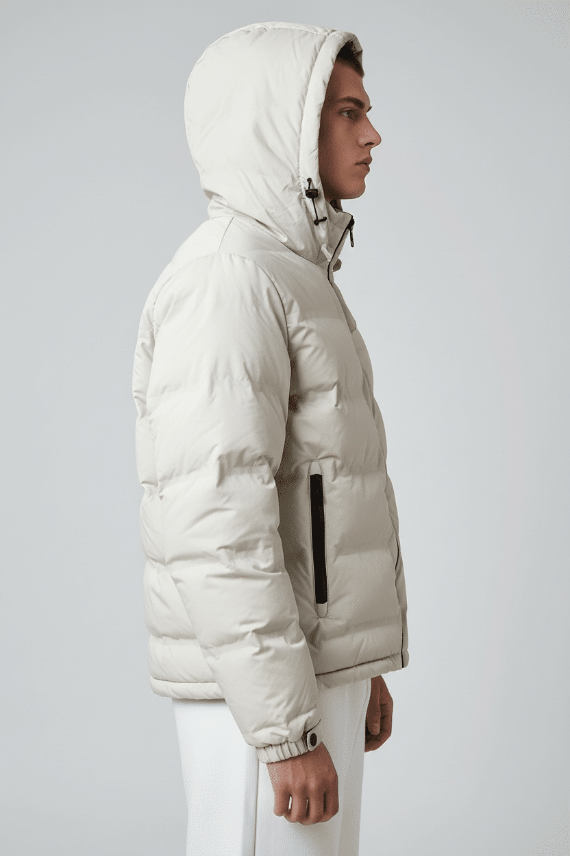 Giubbotto imbottito con cappuccio, chiusura frontale con zip a doppio cursore e tasche laterali con zip. Linea minimal e pulita, polsi regolabili con bottone a pressione e interno foderato per un comfort termico ottimale.