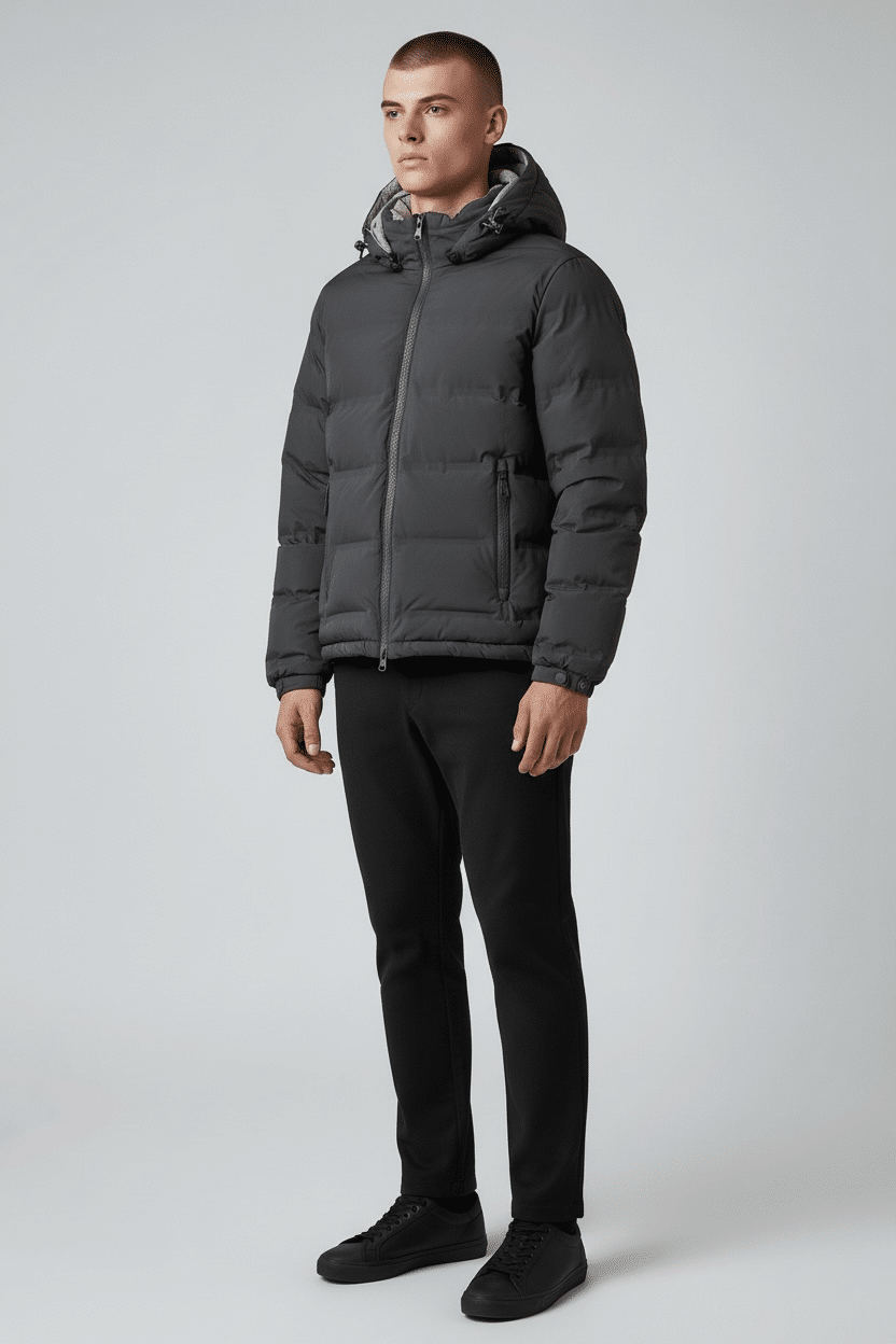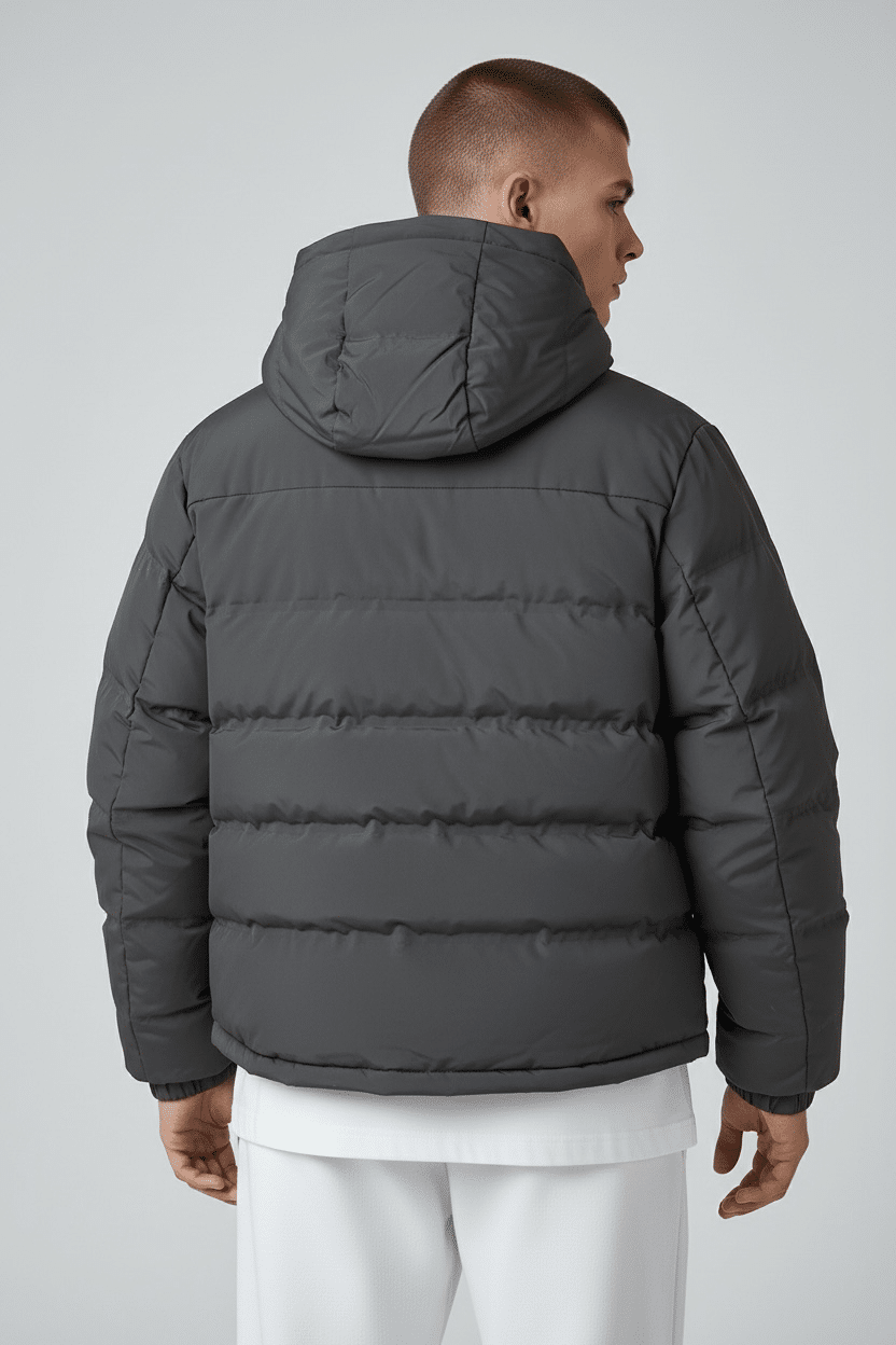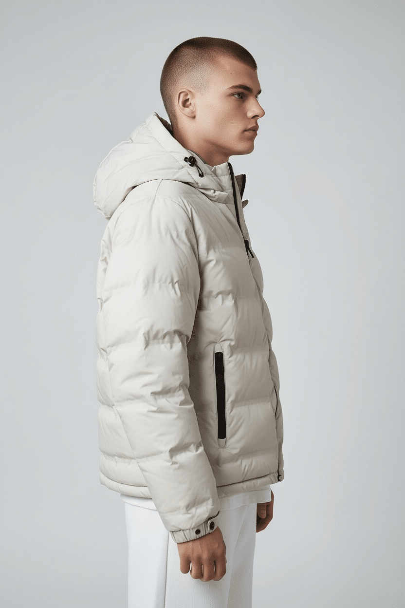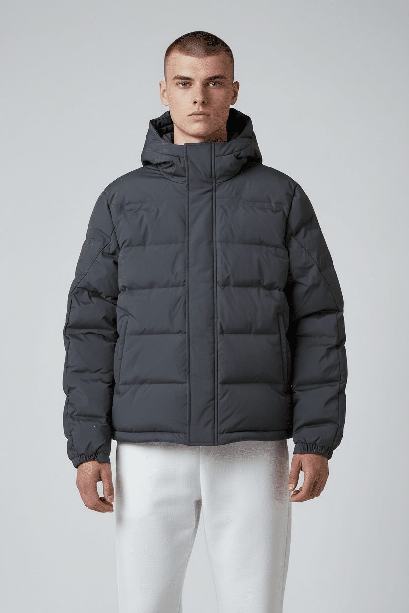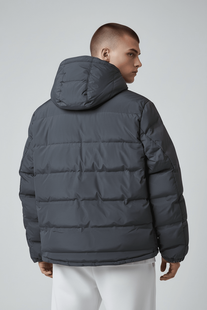 Giubbotto imbottito con cappuccio, chiusura frontale con zip a doppio cursore e tasche laterali con zip. Linea minimal e pulita, polsi regolabili con bottone a pressione e interno foderato per un comfort termico ottimale.