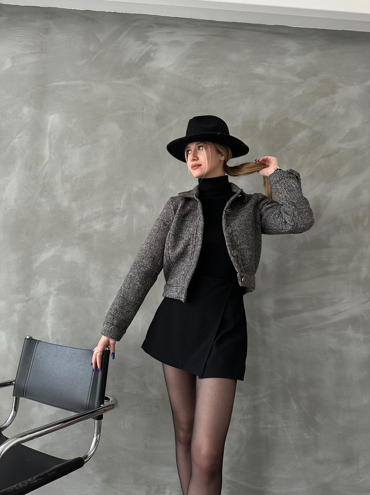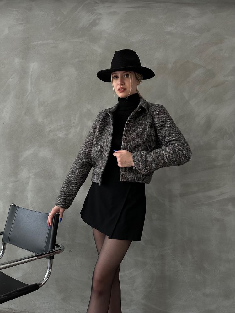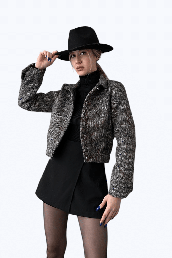 Descrizione della giacca: Questa giacca corta in tweed un capo elegante e sofisticato, perfetto per chi ama unire stile classico e moderno. La sua struttura ben definita e il tessuto raffinato la rendono un must-have per i look autunnali e invernali. Caratteristiche: Colore: Mix di grigio e nero, che dona un effetto raffinato e facilmente abbinabile. Materiale: Tweed strutturato, un tessuto caldo e resistente, tipico delleleganza senza tempo. Modello: – Taglio corto e aderente, che valorizza la silhouette. – Collo classico con chiusura a bottoni, per un tocco strutturato. – Maniche lunghe leggermente over, per un look rilassato ma sofisticato. – Orlo dritto, che si abbina perfettamente a gonne e pantaloni a vita alta. Come abbinarla: Look elegante: Indossala con dolcevita nero e minigonna a portafoglio, come in foto, per un outfit chic e femminile. Stile casual-chic: Perfetta con jeans a gamba dritta e stivaletti, per un look pi rilassato ma trendy. Business attire: Abbinata a pantaloni sartoriali e mocassini, per un tocco professionale e sofisticato. Autunno trendy: Completa loutfit con un cappello a tesa larga, per un tocco bohmien e alla moda. Questa giacca in tweed un capo versatile e senza tempo, perfetto per chi cerca raffinatezza e tendenza in ununica giacca!