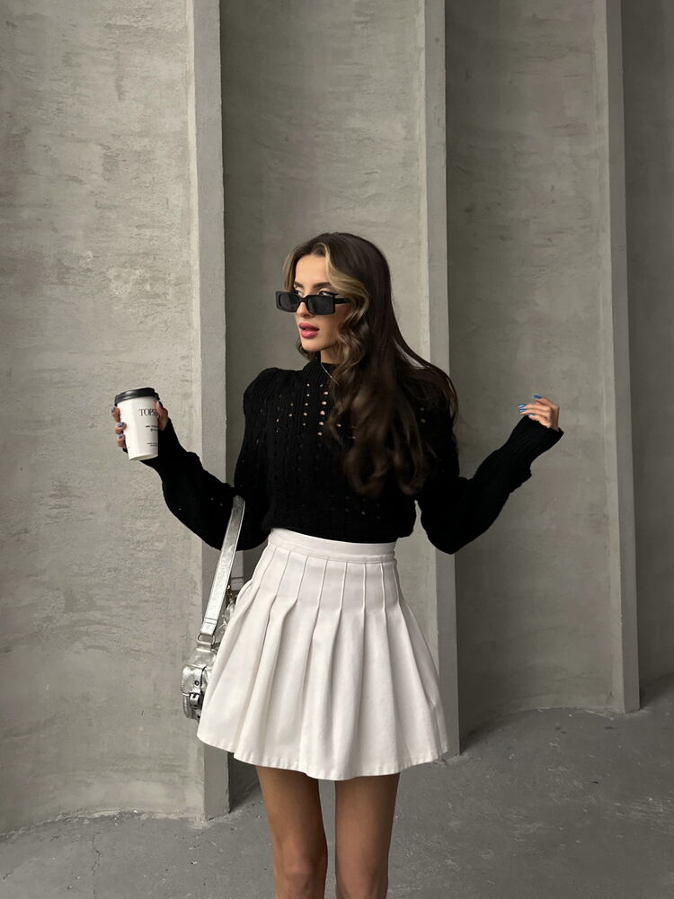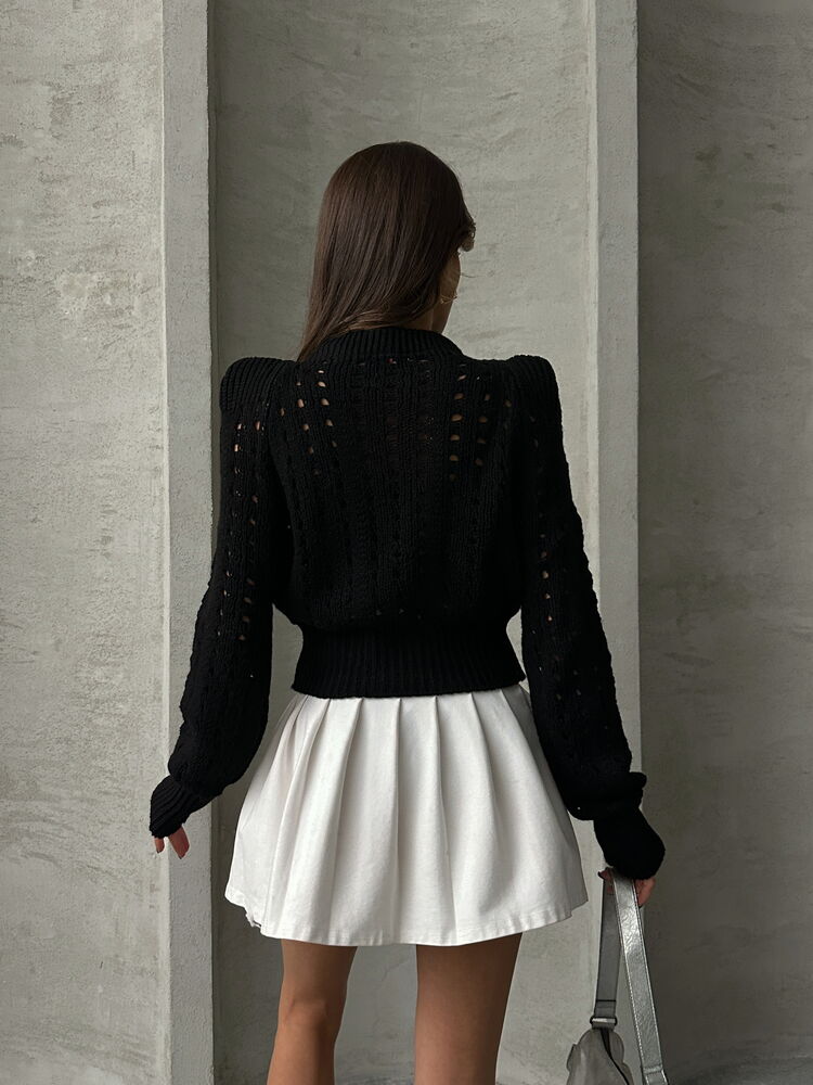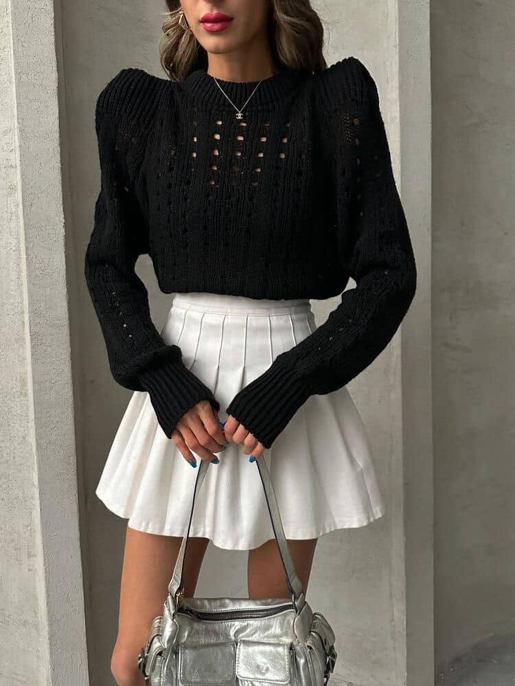 Questo maglione nero a maniche lunghe un capo elegante e sofisticato, perfetto per creare un look chic e raffinato. Caratteristiche: Colore: Nero, un classico senza tempo, perfetto per outfit eleganti e versatili. Vestibilit: Aderente e leggermente corto, creando un effetto cropped che valorizza il punto vita. Tessuto: Probabilmente in maglia lavorata, con dettagli traforati sulla parte superiore che aggiungono un tocco di femminilit e ricercatezza. Dettagli: Spalle leggermente strutturate, che danno un tocco moderno e sofisticato al design. Stile: Chic ed elegante, perfetto per abbinamenti sia casual che pi ricercati. Come abbinarlo: Look femminile: Perfetto con una gonna plissettata bianca come in foto, per un contrasto elegante e romantico. Casual-chic: Con un jeans a vita alta e stivaletti per un look pi rilassato ma sempre curato. Elegante e moderno: Con un pantalone palazzo e tacchi per un outfit raffinato e adatto a occasioni pi formali. Rock e audace: Con una gonna di pelle e anfibi, per un look dal carattere pi grintoso. Un capo versatile e sempre di tendenza, ideale per un outfit sofisticato e glamour!